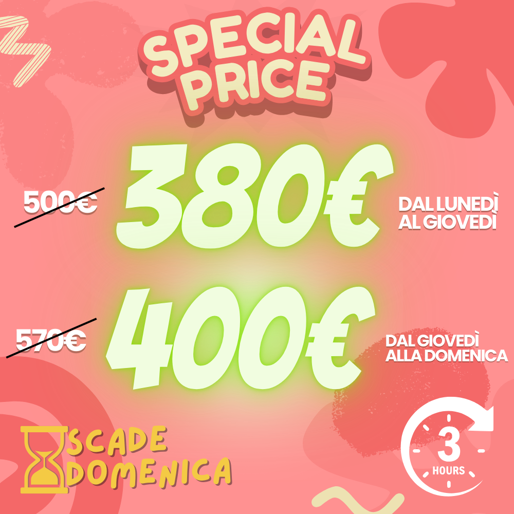 *Ai prezzi indicati potrebbe essere applicata una tariffa per il trasporto in base alla città o al quartiere di appartenenza; il costo parcheggio non è incluso e non possiamo servire zone centrali disagiate da varchi e ZTL, previo autorizzazione targa da concordare. I pacchetti potrebbero subire delle variazioni in base a scelte prese dagli animatori al momento della festa.